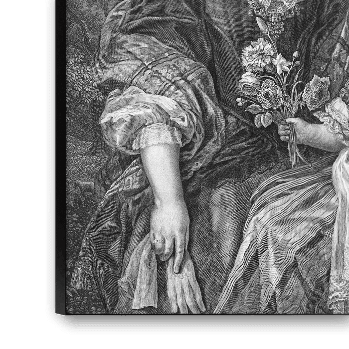 This is a fine and detailed portrait engraving in black and white depicting an elegant lady together with her daughter.