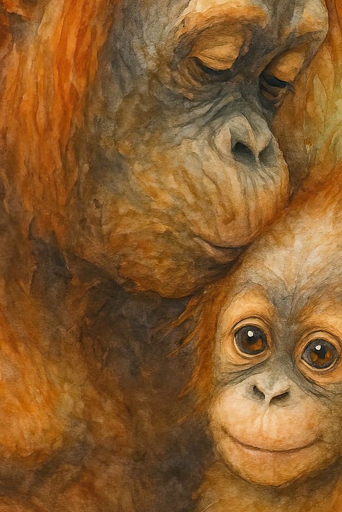 This watercolour painting shows a Sumatran orangutan mother gently holding her young against her. Her eyes are closed in a peaceful, protective pose, while the little one looks curiously out into the world with large, shining eyes full of confidence. The warm rust-brown hues of their fur blend harmoniously with the soft, greenish background.