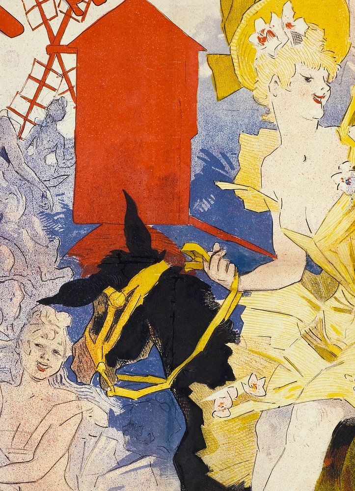 Advertising of the Mourin Rouge from Paris, the burlesque striptease dance theatre. The dancer of the striptease is sitting at the front on a donkey and the girl is wearing a yellow dress. All the dancers are scantily dressed in a dress and wearing a hat.