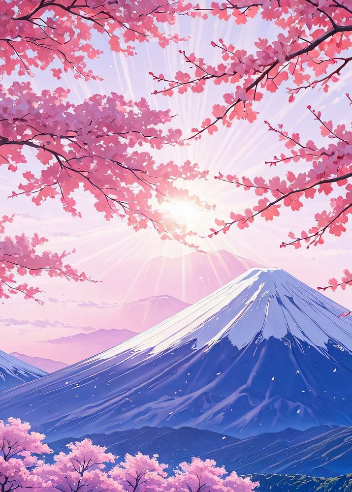 mount fuji sunrise painting, cherry blossom reflection art, sakura and mountain landscape, Japanese nature wall art, anime style mount fuji, spring in japan artwork, sakura morning glow illustration, peaceful mount fuji scenery, cherry blossom lake reflection, traditional Japan art decor