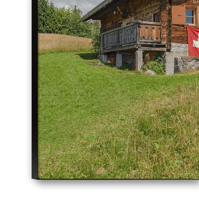 Buy the photo Mountain hut decorated with swiss flags, Gryon, Canton Vaud, Switzerland by Rene van der Meer on canvas, ArtFrame, poster and wallpaper, printed on demand in high quality.