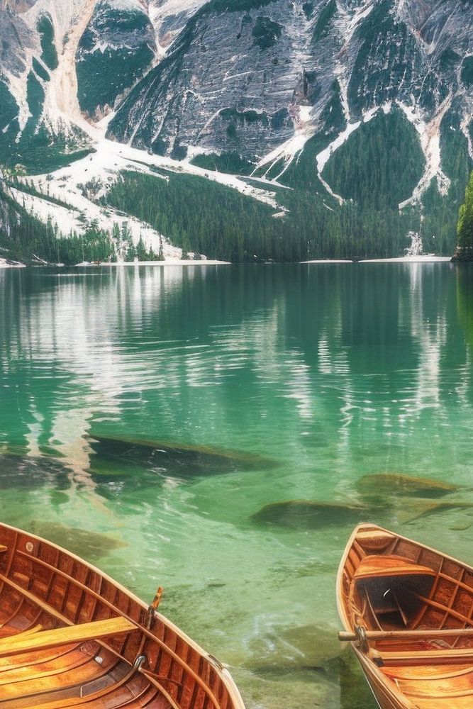 This breathtaking picture shows a clear mountain lake in the Dolomites, surrounded by majestic mountains and lush forests. The two traditional wooden boats in the foreground and the crystal clear water create a calm and idyllic atmosphere. Perfect for lovers of nature, mountains and landscape photography, this artwork brings the peaceful beauty of the Dolomites into your living space. Ideal for living rooms or offices, it is a wonderful addition to any collection of nature photography and landscapes.