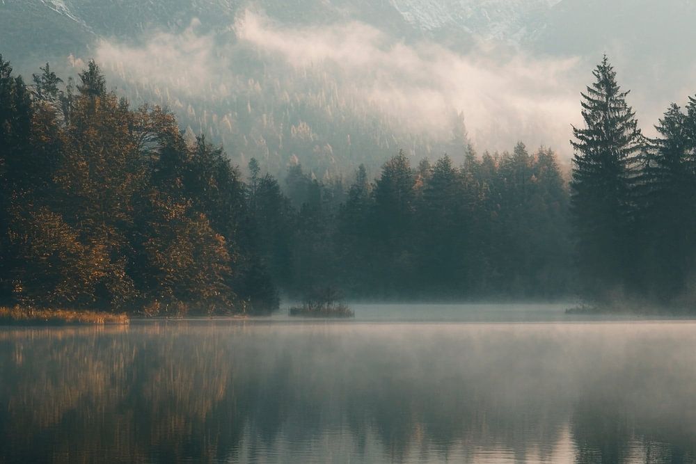 A calm morning by the smooth lake, where the majestic mountains are reflected in the water. Wisps of mist outline gentle contours, while the trees frame the scenery in warm shades of red and brown. This harmonious combination immerses the viewer in a peaceful, almost magical world.