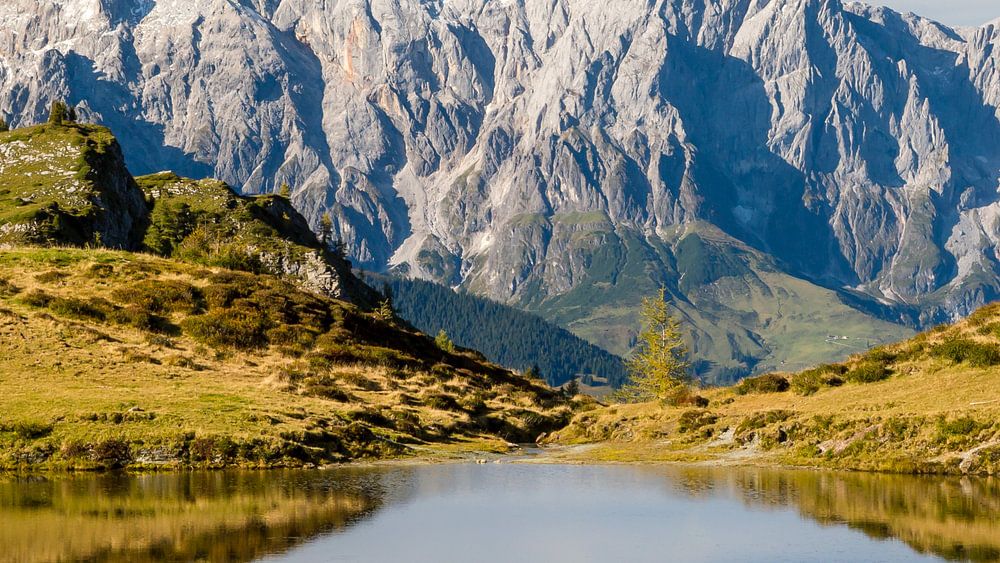 The scruffy mountain massif of Hochkönig towers above the small mountain lake called Obere Paarsee. This is a popular hike of both Großarl (Tal der Almen) and the Gasteinertal.