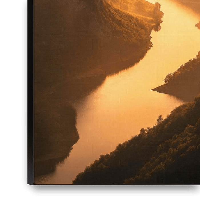 In the gentle morning light, a calm river glides through majestic valleys, while the golden rays of the sun embrace delicate wafts of mist. The gentle hills unfurl like waves that merge together in a harmonious dance. A feeling of peace and endless expanse fills the air and invites you to savour the beauty of nature to the full.