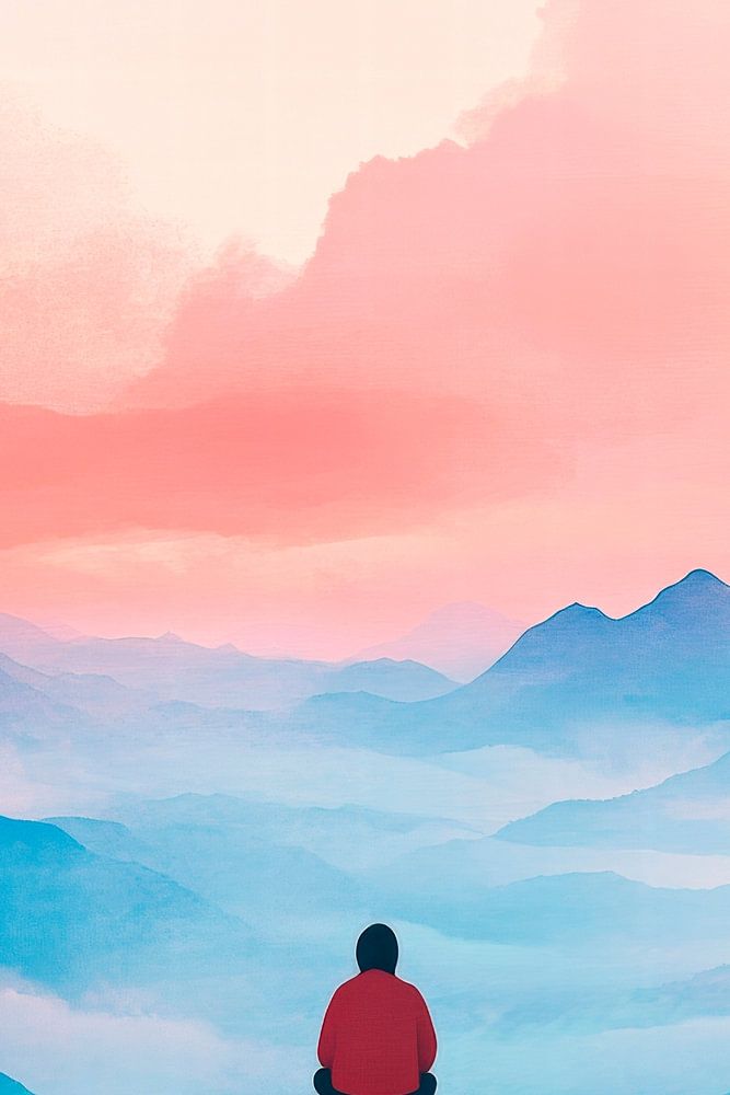 A fascinating interplay of soft pastel colours draws the viewer in: A solitary figure sits on a peak and gazes into a mist-covered mountain landscape. The harmonious colour composition of sky and earth conveys calm and contemplation. Ideal for a bedroom, this work of art creates a meditative retreat for relaxing nights.