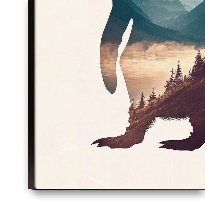 A fascinating interplay of animals and nature, where the majestic silhouette of a penguin merges with snow-covered mountains and dense forests. The soft colour tones create a harmonious atmosphere, ideal for a living room that invites you to dream and relax. This work of art tells stories of freedom and adventure.