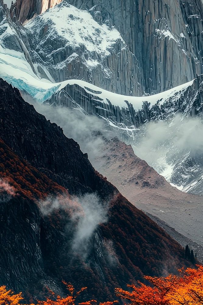 Majestic peaks defy the sky, shrouded in mystical wafts of mist. The bright orange of the autumn forests creates a fascinating contrast to the cool, snow-covered mountain peaks. This captivating landscape motif brings a touch of adventure and tranquillity to any living room and invites you to spend hours daydreaming. Ideal for nature lovers!