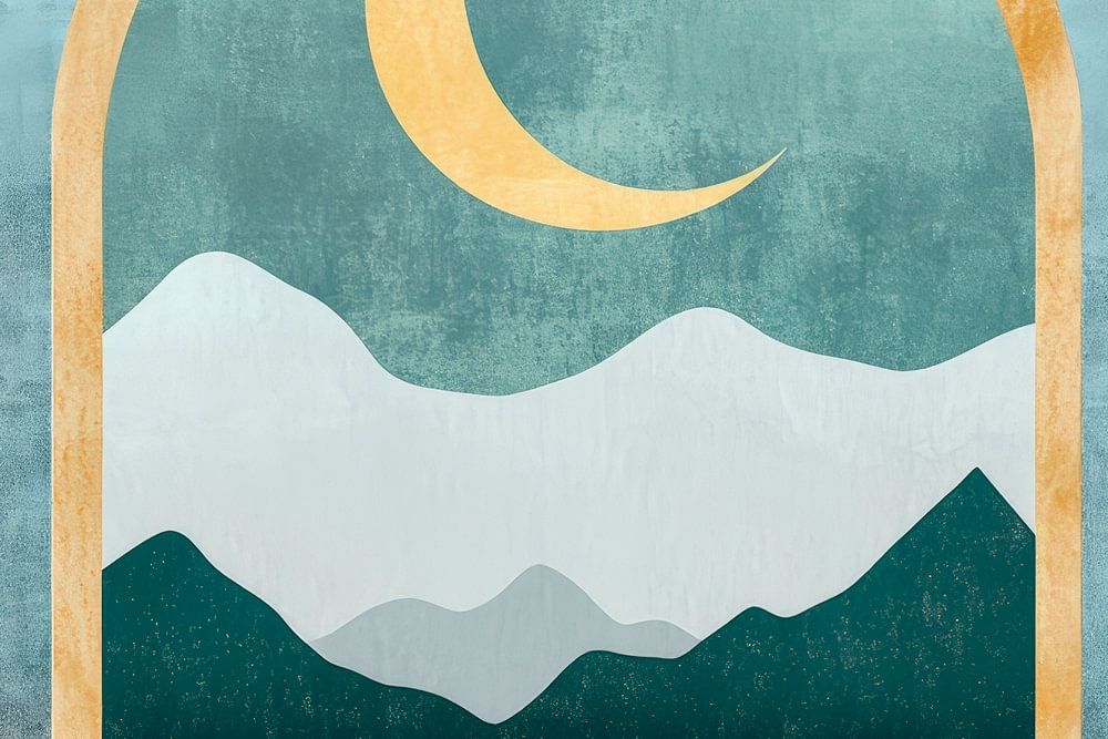 A mysterious view through a golden frame reveals a harmonious blend of soft blue tones, glistening water and elegantly curved mountains. The moon and a delicate cloud create a tranquil atmosphere, perfect for a bedroom to encourage dreams and relaxation.