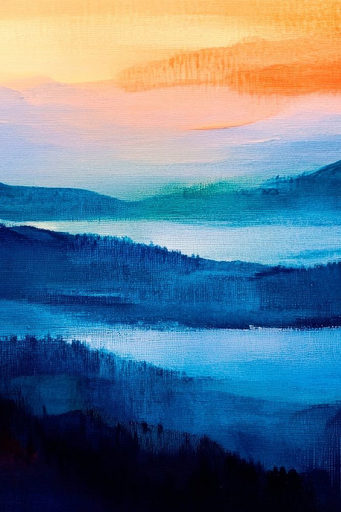 The gentle colour gradients of blue and orange transport you to a romantic morning landscape where the mist floats gently over the hills. This harmonious interplay of tranquillity and vastness invites you to dream and is perfect for the bedroom to create a relaxing atmosphere.