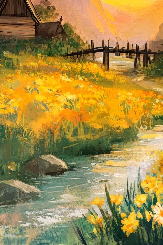 The landscape glows in soft orange tones, while the sun's rays illuminate the flowers in the foreground. A picturesque river meanders between gentle hills, with a charming wooden footbridge perfectly complementing the idyllic picture. This work of art lends any living room a relaxed, harmonious atmosphere and invites you to daydream.