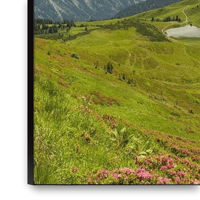 On a gloriously sunny July day, the impressive panorama of the Fellhorn rises majestically, framed by a lively symphony of blooming alpine roses. The bright, pink blossoms of the alpine roses contrast impressively with the deep blue of the sky and the lush green of the surrounding meadows. The air is filled with a delicate, sweet…