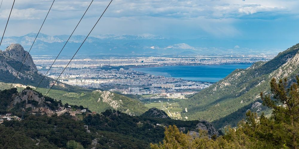 This breathtaking view shows the majestic Taurus Mountains above Antalya with spectacular views of the turquoise-blue Mediterranean Sea. The forested mountain valleys stretch down to the coastal plain of the Turkish Riviera, while power lines emphasise the modern infrastructure of the region. The rugged limestone cliffs of the Taurus contrast beautifully with the Mediterranean vegetation and the endless blue of the sea. This unique panorama perfectly illustrates the geographical diversity of Antalya between the Alpine mountains and the Mediterranean coast.