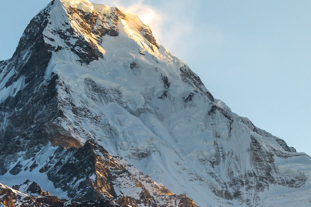 Mountain peak in the morning at Poon Hill in the Annpurna mountains in Nepal. Sunlight shines golden light on the mountain.