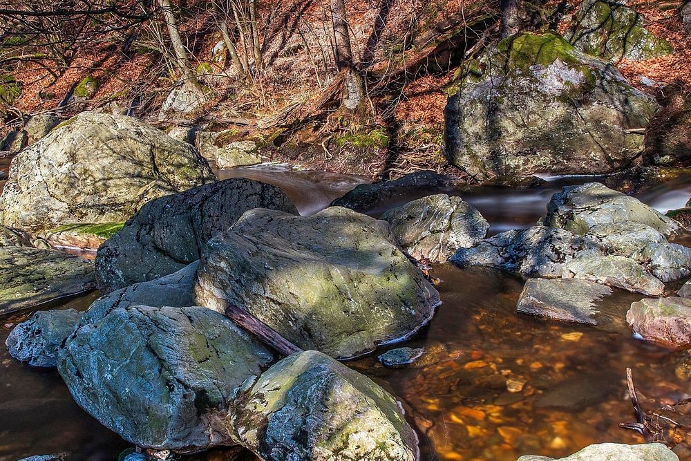In the Ardennes, a number of mountain rivers including the Ninglinspo and this Hoëgne fed by rainwater flow through a landscape with boulders giving the whole a "prehistoric" character. The most attractive period is autumn because the leaves enhance the colors and more sunlight reaches the ground. The use of a Neutral Density filter for the purpose of a slow shutter speed makes the water look creamy.