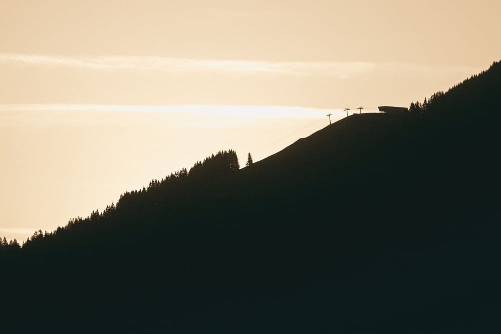 The yellow colored sky forms a strong contrast with the mountainside. The trees and the ski lift are funny details that catch your eye when you follow the line of the mountain upwards. The photo was taken near Kitzbühel in Tirol, Austria.