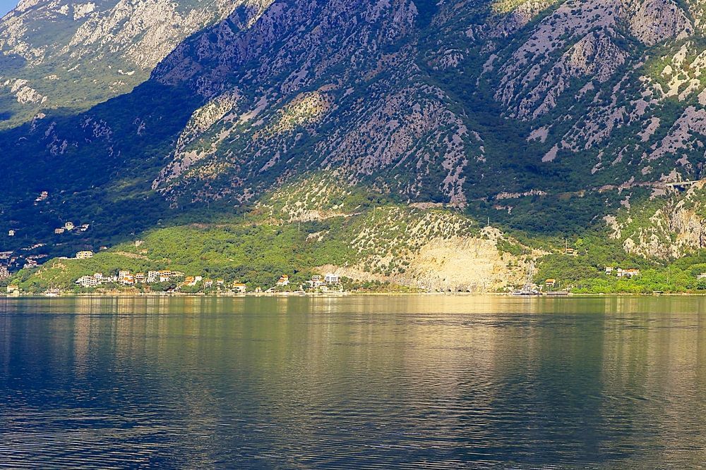 In the morning in the Adriatic coast between Risan and Perast the beautiful mountains of Montenegro are reflected in the water while the mountains are illuminated with the first rays of the sun.