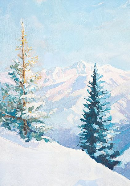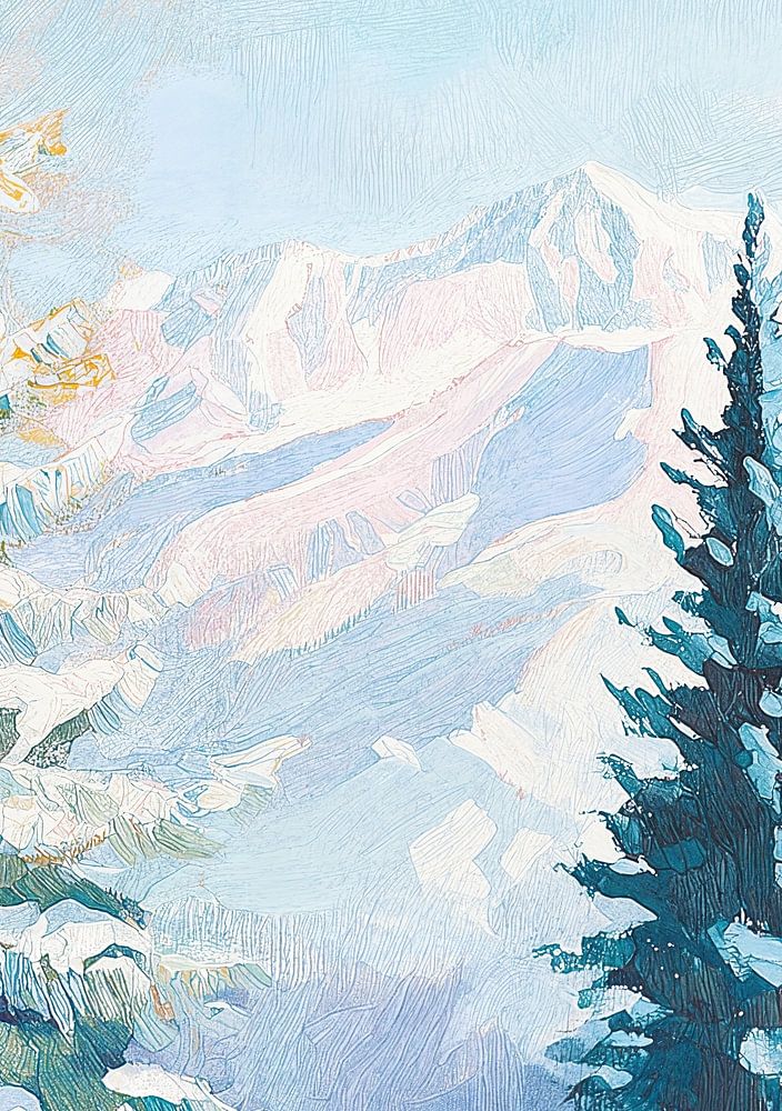An impressionistic painting of a snowy alpine landscape with evergreen trees, muted colours, a blue sky, white snow and pink mountains in the background. The painting is in a vintage oil paint style with a minimalist aesthetic, resulting in a beautiful scene.