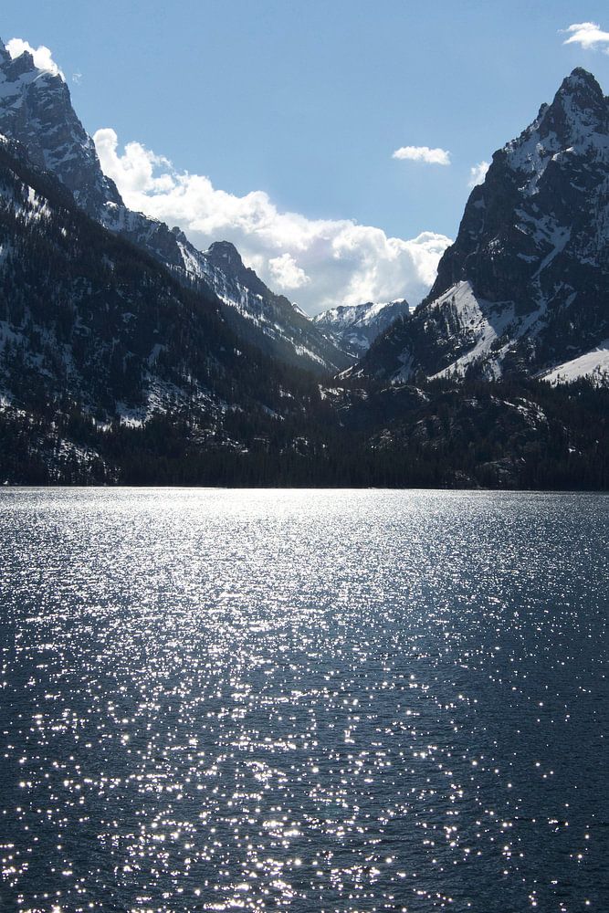 I took this picture in Grand Teton National Park, during our trip through America. A lake with pointed and still a bit snowy mountains. The sunlight is reflecting in the water. There are small clouds hanging above the points of the mountains that also take that shape.