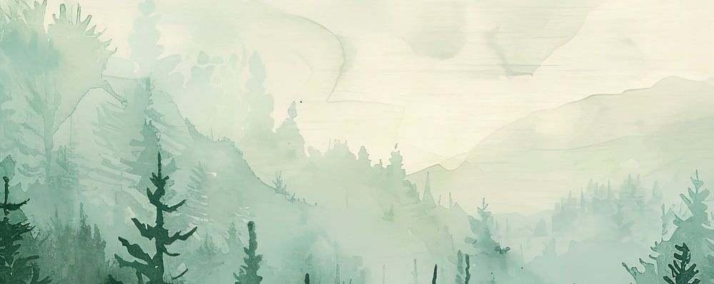 This serene watercolour artwork shows a vast forest landscape, shrouded in a soft mist that conceals the depth of the trees.