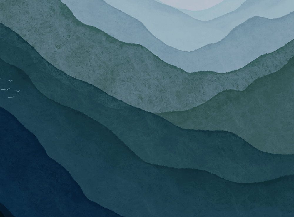 High mountain peaks alternate, inspired by the high mountains of Japan. The birds make their way through the valley, flying toward the horizon.