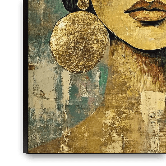 Woman Gold - This painting depicts a modern portrait of a woman with closed eyes and large gold earrings against an abstract, subdued background in earth tones. This painting also features flowers in her hair and many gold and beige accents.