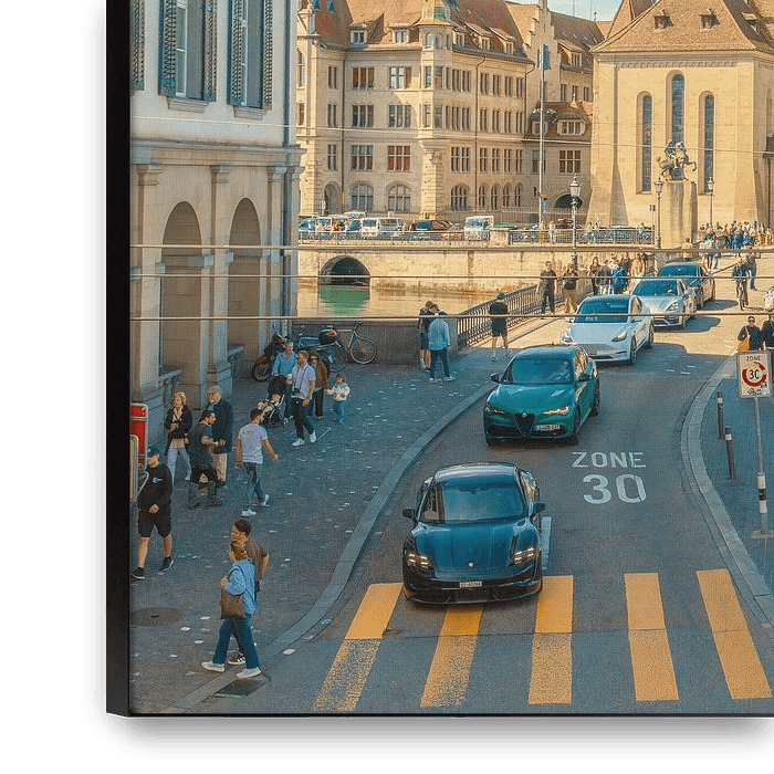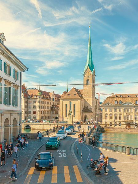 This impressive photograph shows the vibrancy of Zurich with a view of the striking Fraumünster tower. The soft blue tones of the sky create a calm atmosphere that invites the viewer to immerse themselves in the scene. The composition conveys a sense of urban serenity and is perfect for relaxing in a modern living or working space. This…