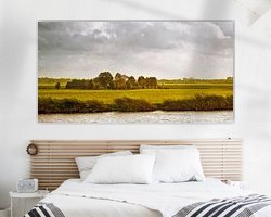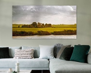 Classic Dutch landscape edited to resemble old Dutch masters painting. Modern element removed. Wide format. Wide angle view with clouds. Made with Leica Medium Format camera, excellent details. Tourism, farming, agriculture. Like Ruisdael.