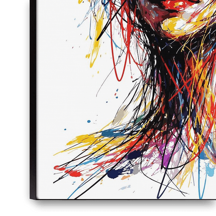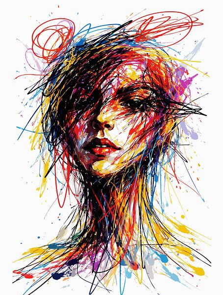 Burst of multihue chaos in this woman abstract, where her enigmatic expression emerges from swirling lines in vibrant reds, yellows, and purples with dynamic drips, evoking turmoil and beauty for enthusiasts of expressive, non-traditional digital artwork.