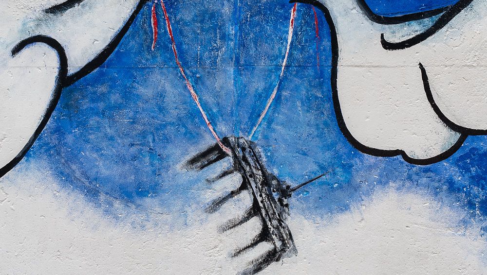 The mural 'Alles offen' (Everything Open) is a painting by artist Rosemarie Schinzler located on the Berlin East Side Gallery. The East Side Gallery is a section of the Berlin Wall that has been transformed into an open-air gallery featuring over 100 murals painted by artists from around the world. The mural 'Alles offen' symbolizing the concept of openness and possibility. The mural has become a popular and iconic image at the East Side Gallery. It is a powerful and thought-provoking piece of art that reflects the themes of freedom and opportunity.