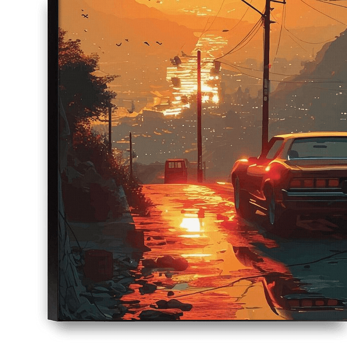 Buy this digital art artwork Muscle Car in Sunset by Ganesh Ulya as a reproduction on canvas, ArtFrame, poster and wallpaper, printed on demand in high quality.