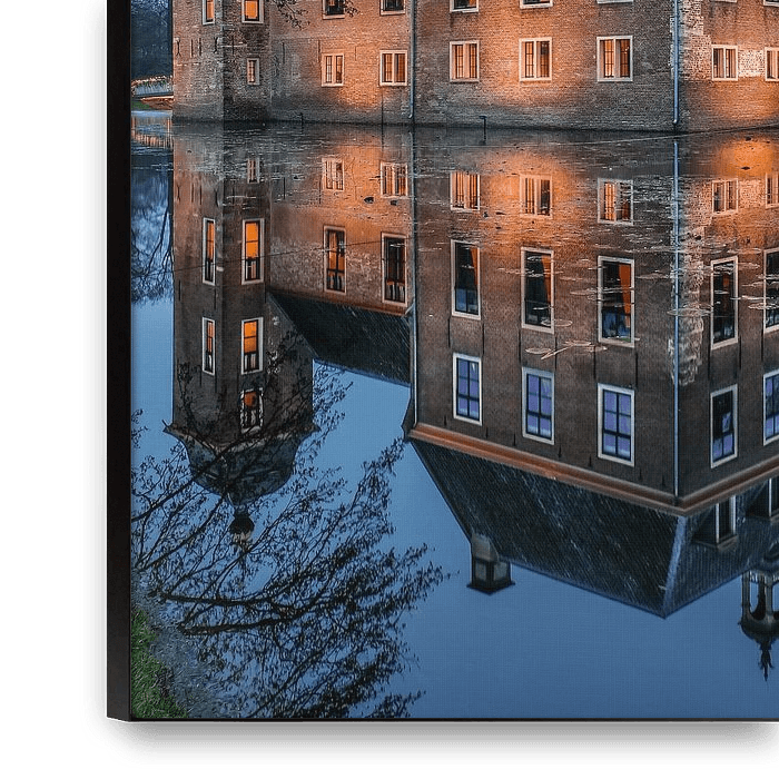 Prachtige weerspiegeling van Museum More in het water tijdens blauwe uurtje.