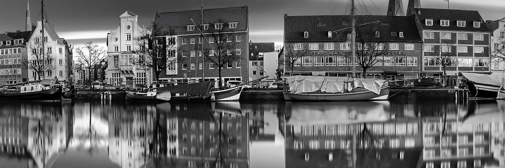 * Lübeck Museum Harbour * Black & White Cityscape. Panorama of the Hanseatic city of Lübeck with the old town, museum harbour and painters' quarter on the Trave / Untertrave in the evening light.