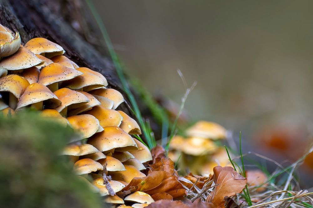 About "Mushrooms growing on a mossy tree trunk in a deciduous forest in autumn"
