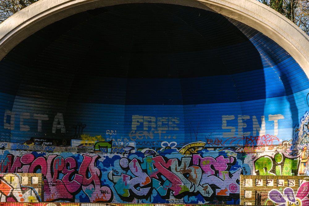 A low evening sun illuminates the graffiti-painted famous music dome in the Sterrebos of the city of Groningen. This music dome in the middle of the Sterrebos was designed by Groningen city architect Siebe Jan Bouma. Stars in the Woods was a series of open-air concerts held in the Sterrebos in the city of Groningen between 1974 and 1983. Today, small-scale Summer Concerts are held here under the name Sterrebos Live. This picture was taken in February 2025
