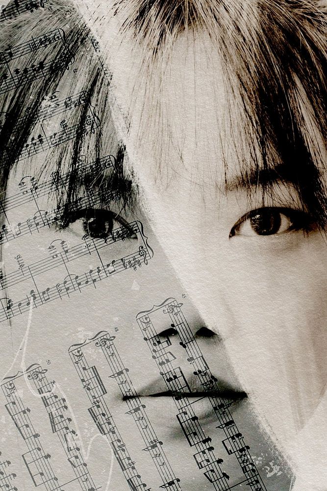Portrait of a young woman from Asia. A timeless portrait with sepia tones and sheet music.