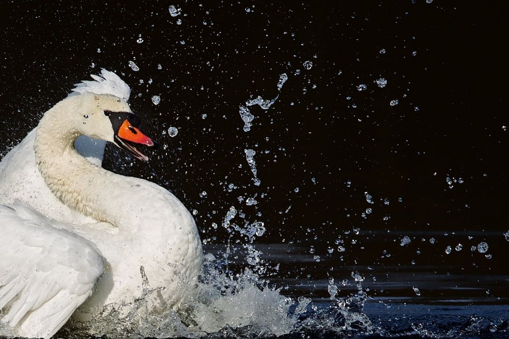 A mute swan (Cygnus olor) preening in the water on a lake in the Mönchbruch nature reserve near Frankfurt, Germany.