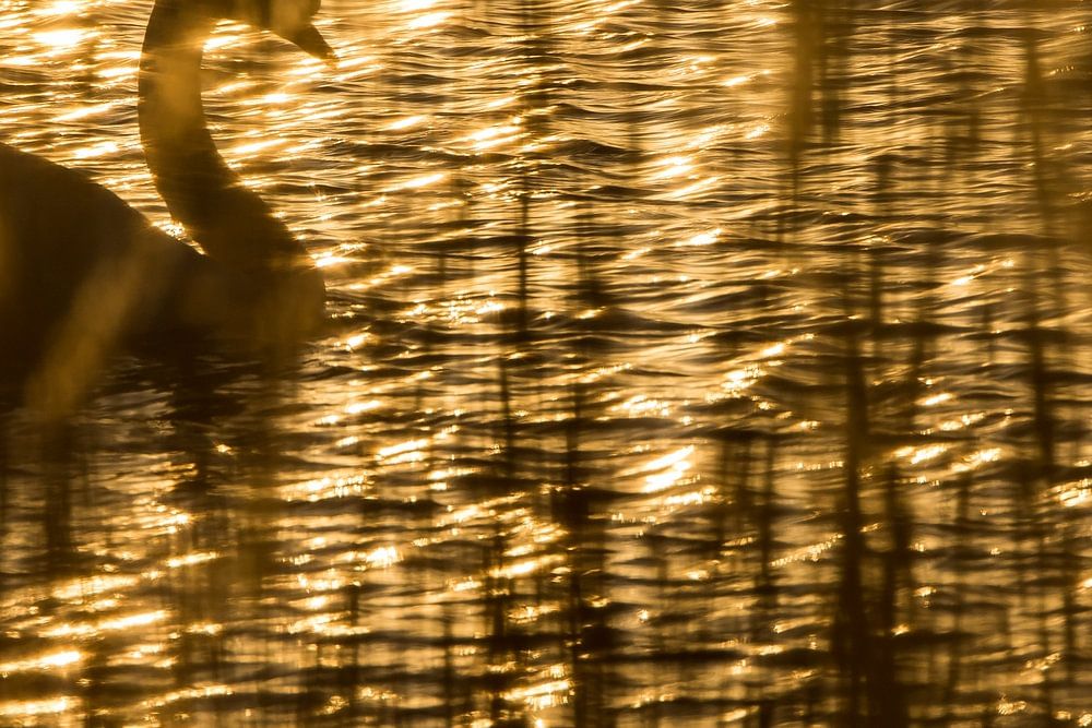 A mute swan in the last light. The silhouette of the swan stands out beautifully in the golden background. The reeds in front of it create an almost abstract image.