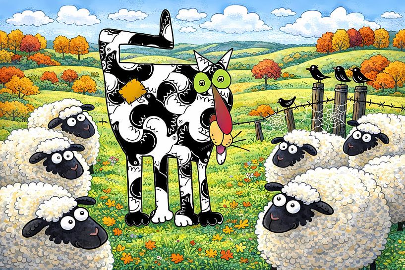 A funny, abstract cat with black-and-white fantasy pattern stands in a meadow, surrounded by curious sheep.