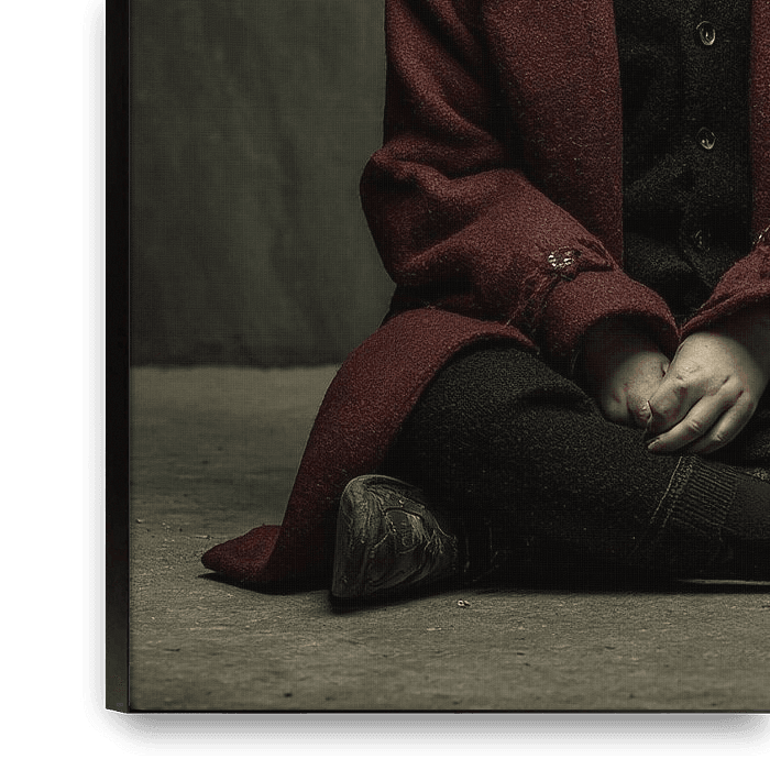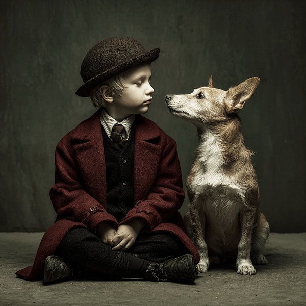 This touching vintage-style digital artwork shows a little boy in a classic red jacket, vest, tie and bowler hat sitting quietly next to his faithful…