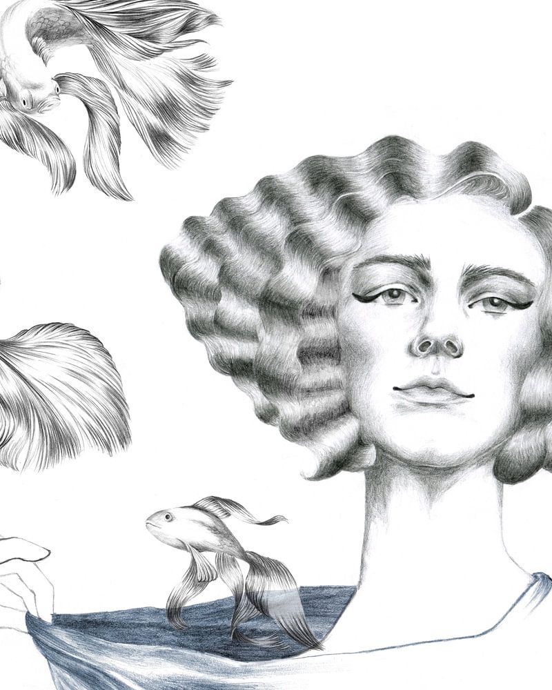 "My Mermaid" is a finely drawn portrait of a woman with finger wave hairstyle in the style of the 1920s. Her blue shirt collar slips off her shoulder, and from it, veil-tail fish emerge – light, floating, dreamlike.