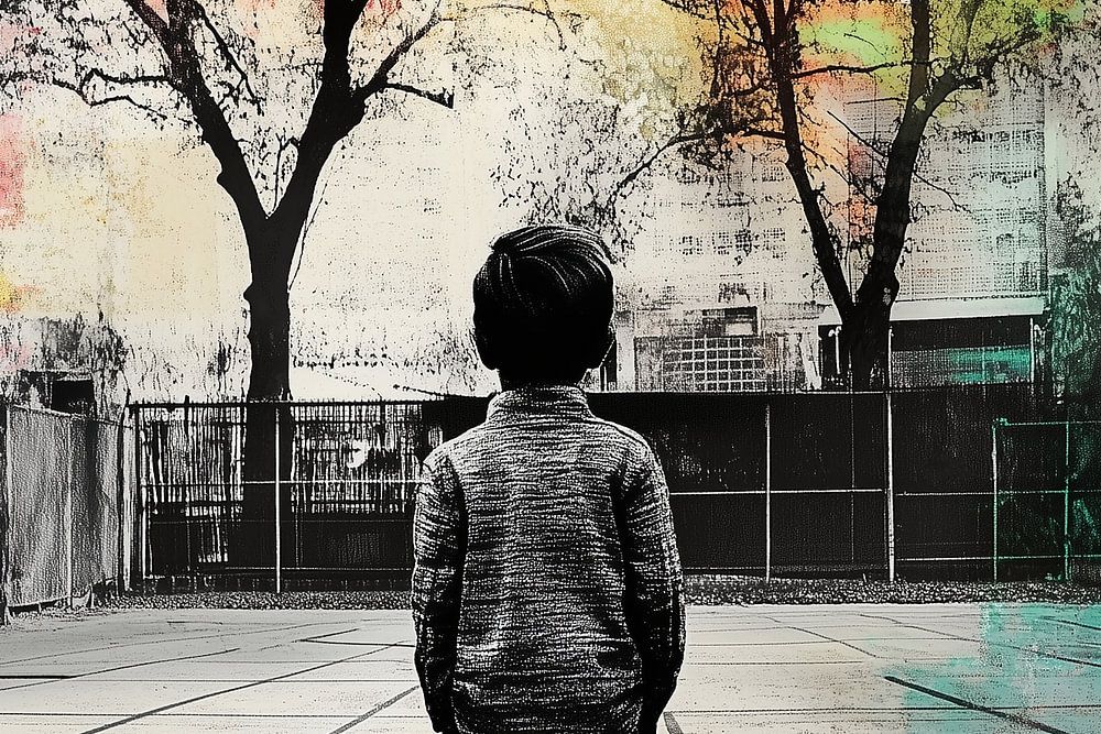 In het midden van het beeld staat een klein kind, van achteren gezien, stil en rechtop. Zijn handen rusten in zijn zakken, zijn houding is eenvoudig maar vastberaden. Hij staat op een leeg speelplein waarvan de strakke lijnen in het beton als perspectieflijnen naar de horizon lopen. Het raster van het plein versterkt het gevoel van…