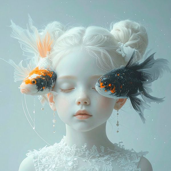 A beautiful girl, with pale, porcelain-like skin and closed eyes, is dreaming her dream. She has a serene, peaceful expression, innocent and pure. The fish floating around her head symbolise her thoughts, ideas that drift about. The light and white colours symbolise her innocence and purity; it radiates tranquillity. The image was…