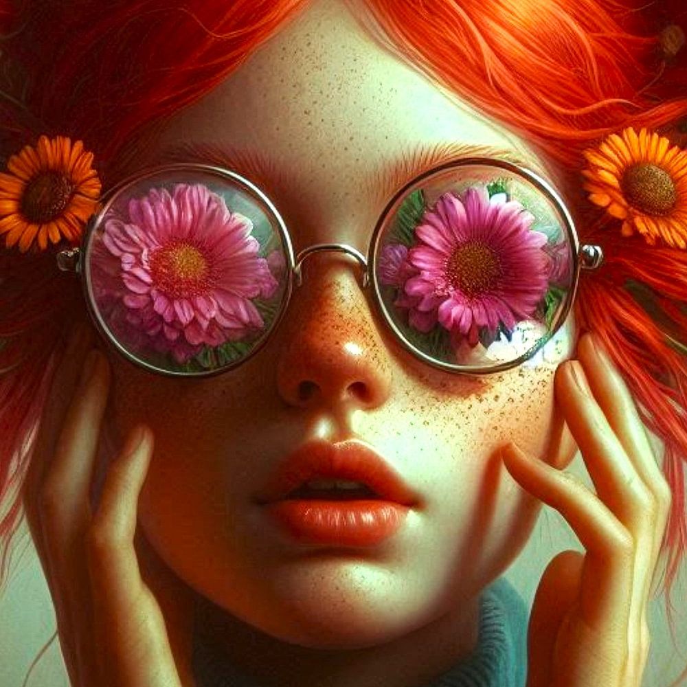 Portrait of a girl/woman with red hair and big glasses, this colourful portrait has flowers in many colours, yellow, red, blue, pink, purple. It makes it a cheerful and colourful picture, because the flowers are everywhere, it makes the whole picture a bit surreal, but certainly special to look at
