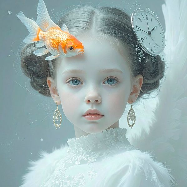 A dreamy portrait of a beautiful young girl with almost porcelain skin and bright blue eyes. In her hair is a clock, symbolising the passing of time; a fish floats past her head, symbolising her thoughts. She wears large gold earrings. The white lace clothing and white feathers suggest the child’s angelic and pure nature, fragile and…