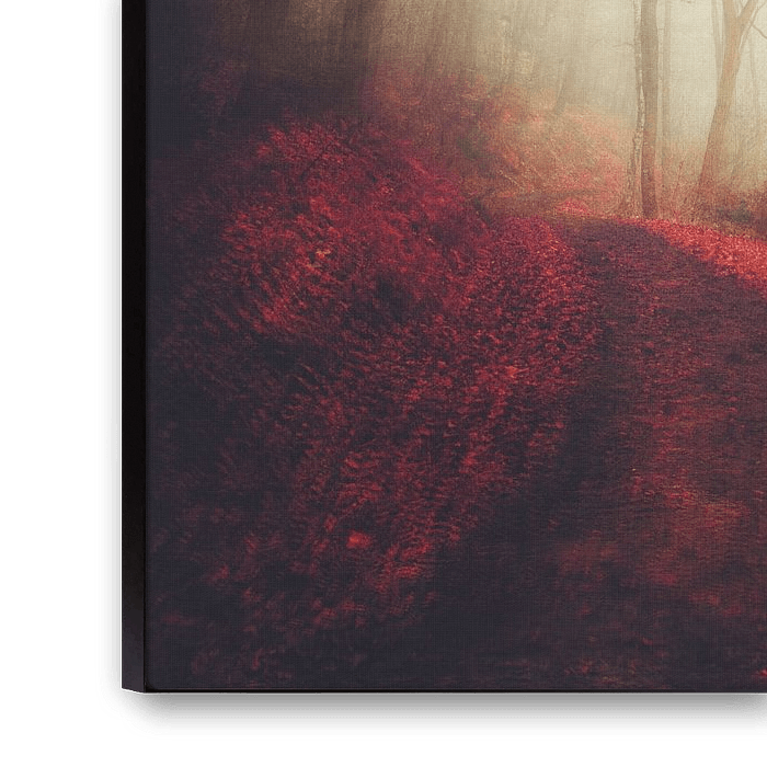 A winding forest path is enveloped in a mysterious, foggy ambiance, with vibrant red leaves carpeting the ground. The bare trees create an ethereal tunnel effect, leading the viewer's eye into the misty distance.
