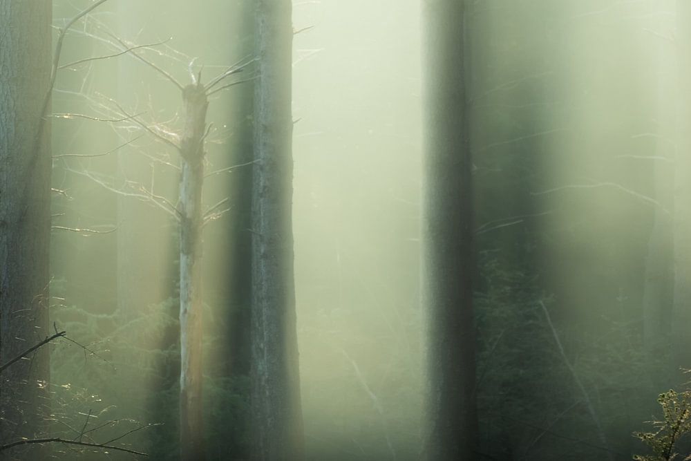 Mysterious light on an early foggy morning on the Veluwe, the Netherlands.