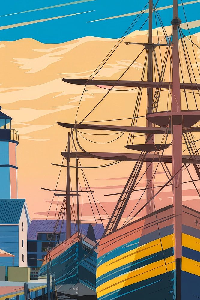 A maritime dreamland unfolds in soft pastel colours, where majestic ships rock gently in the water. The charming coastal architecture and the lighthouse bear witness to the picturesque romance of the harbour. Ideal for the living room, it brings a sense of adventure and relaxation into the home, as if the sea breeze is always present.