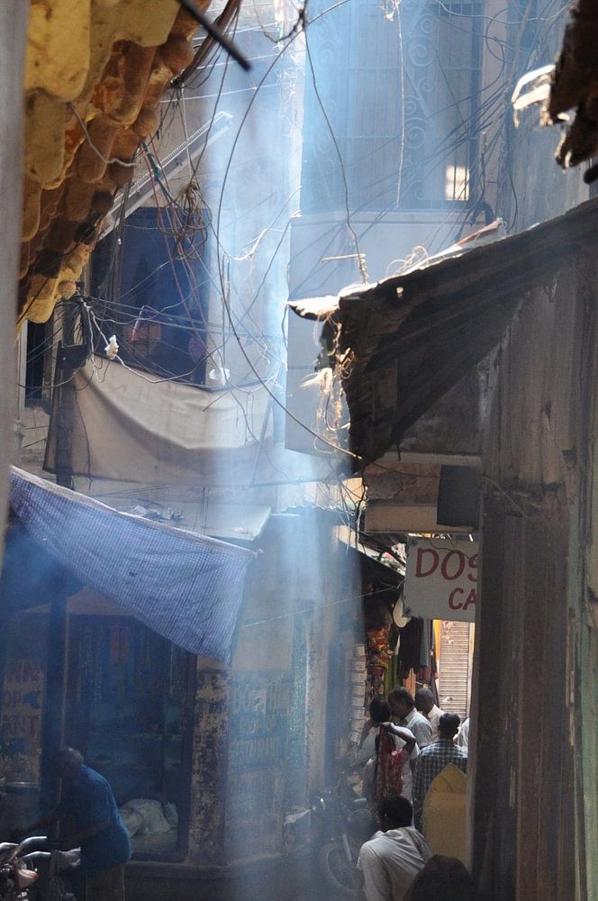 In the narrow streets of Varanasi, a ray of light pierces through the ancient façades, briefly illuminating the surrounding darkness. The contrast between light and shadow reveals the textures and details of the walls, telling the centuries-old stories of this sacred city.