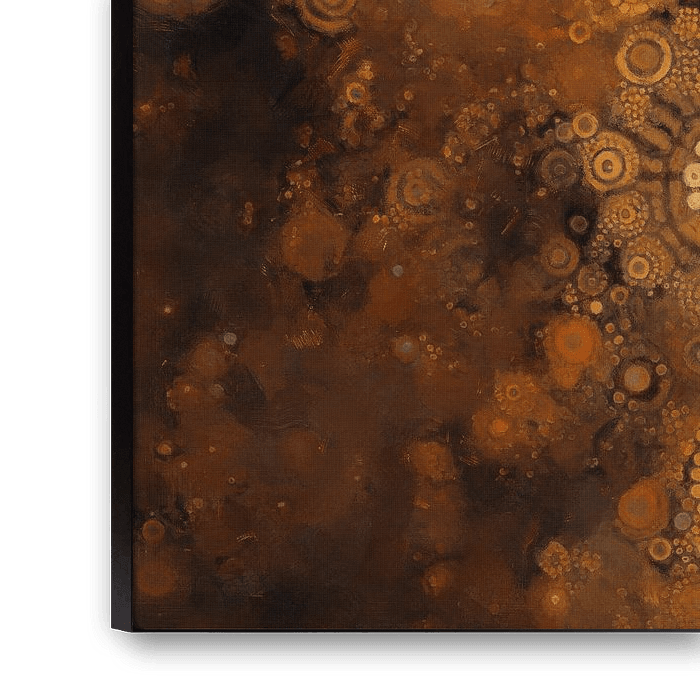 This work shows a rich, dark brown background with complex, circular patterns in different shades of brown and orange. The overlapping of circles and subtle variations in colour and texture give a sense of depth and mystery. This composition evokes a warm and inviting atmosphere, perfect for a cosy living room or a stylish study. The dark tones and intriguing patterns attract attention and invite further investigation. This work combines organic forms with a structured structure, creating a dynamic yet harmonious whole.